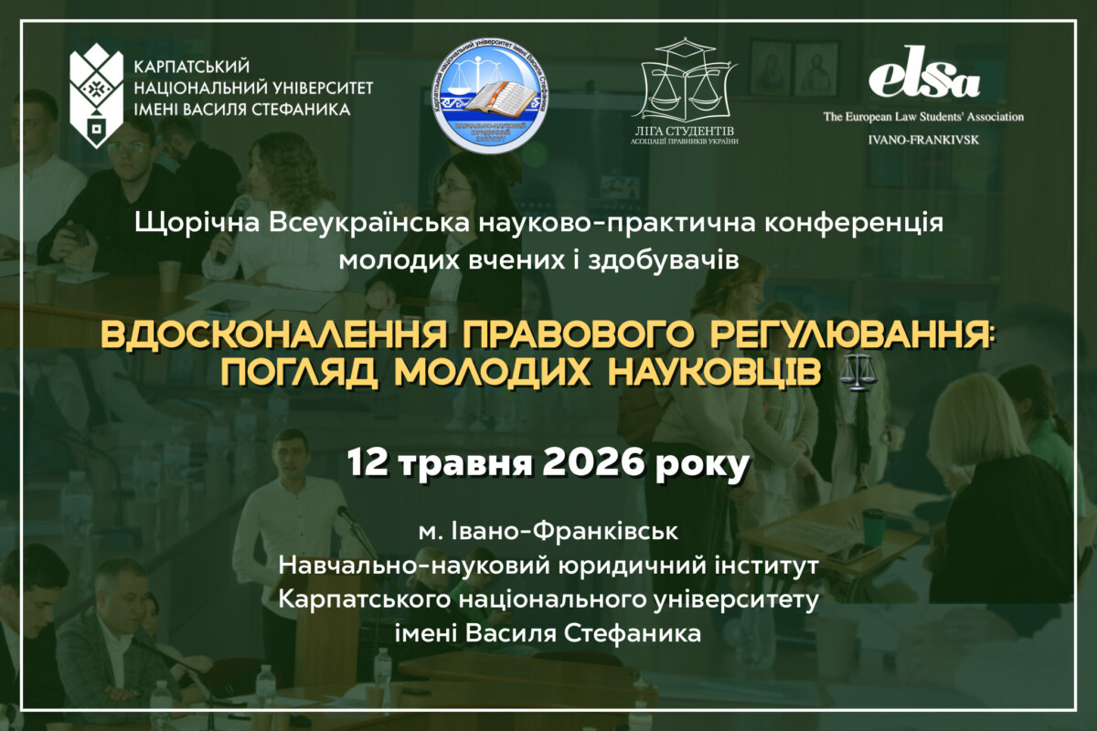 Інформуємо Вас, що 12 травня 2026 року в Навчально-науковому юридичному інституті Карпатського національного університету імені Василя Стефаника відбудеться щорічна Всеукраїнська науково-практична конференція «Вдосконалення правового регулювання: погляд молодих науковців» у змішаній формі (оффлайн+онлайн).